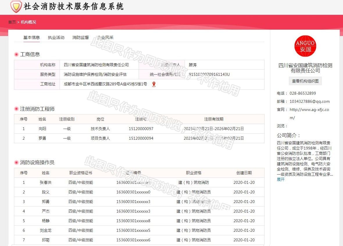 四川省安國建筑消防檢測有限責(zé)任公司,成立于1998年,經(jīng)四川省公安消防總隊批準(zhǔn),工商部門注冊的獨立法人單位。